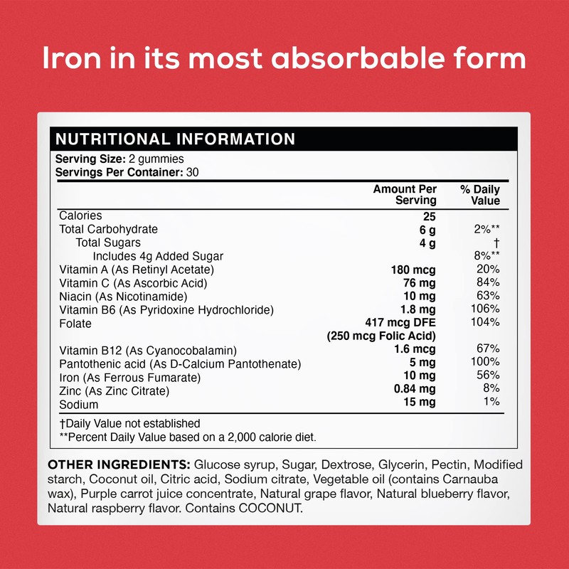 - FORTIFIED WITH ESSENTIAL MICRONUTRIENTS: Our iron gummies for adults are infused with a blend of body and brain-boosting micronutrients like folic acid, zinc, and vitamins B6, B12, B5 and A to provide additional immune-supporting benefits.