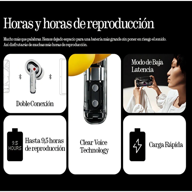 Ear (a) cuenta con una batería más grande que los Ear (2), por lo que puede ofrecer un tiempo de reproducción sin interrupciones un 42,5% mayor con una sola carga.