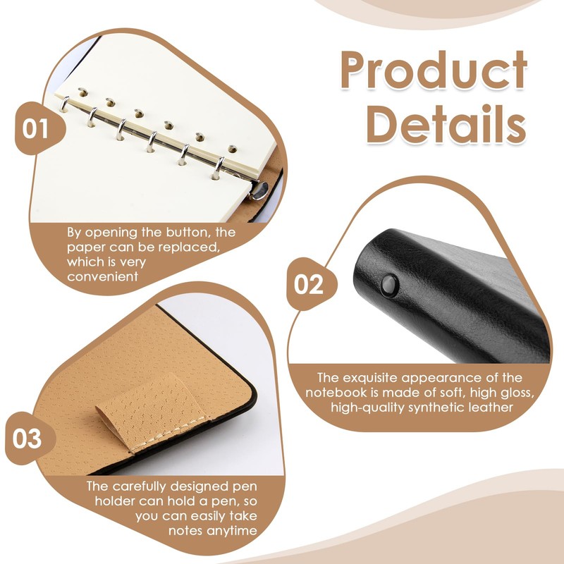 Der 6-Ring-Mechanismus des Notizbuchs sorgt für eine einfache Handhabung und ermöglicht das schnelle Austauschen der Blätter, sodass Sie Ihre Arbeit ohne Verzögerung fortsetzen können. Das Notizbuch eignet sich hervorragend für journaling, Besprechungsnotizen, Skizzieren oder Planen. Es ist eine ausgezeichnete Wahl für den täglichen Gebrauch zu Hause, im Büro oder in der Schule.