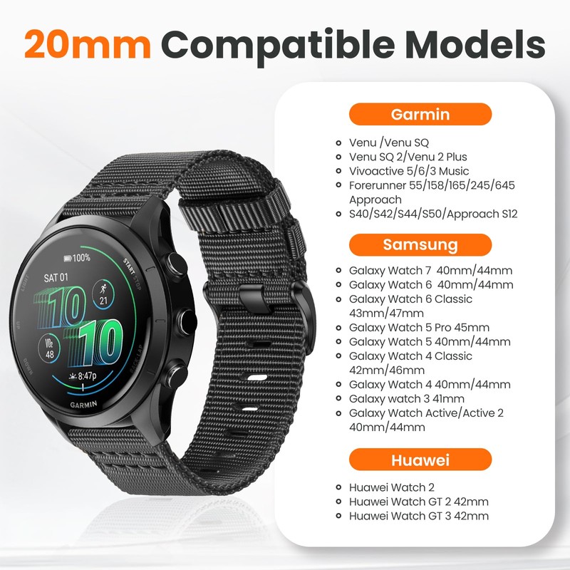 - 👍Compatible Models: This 20mm quick release watch band is designed for Garmin vivoactive 3/5/6, Garmin Venu /Venu SQ/Venu SQ 2/Venu 2 Plus, Forerunner 55/158/165/245/645,etc. Please ensure you select the correct size for your Galaxy Watch before purchasing.
