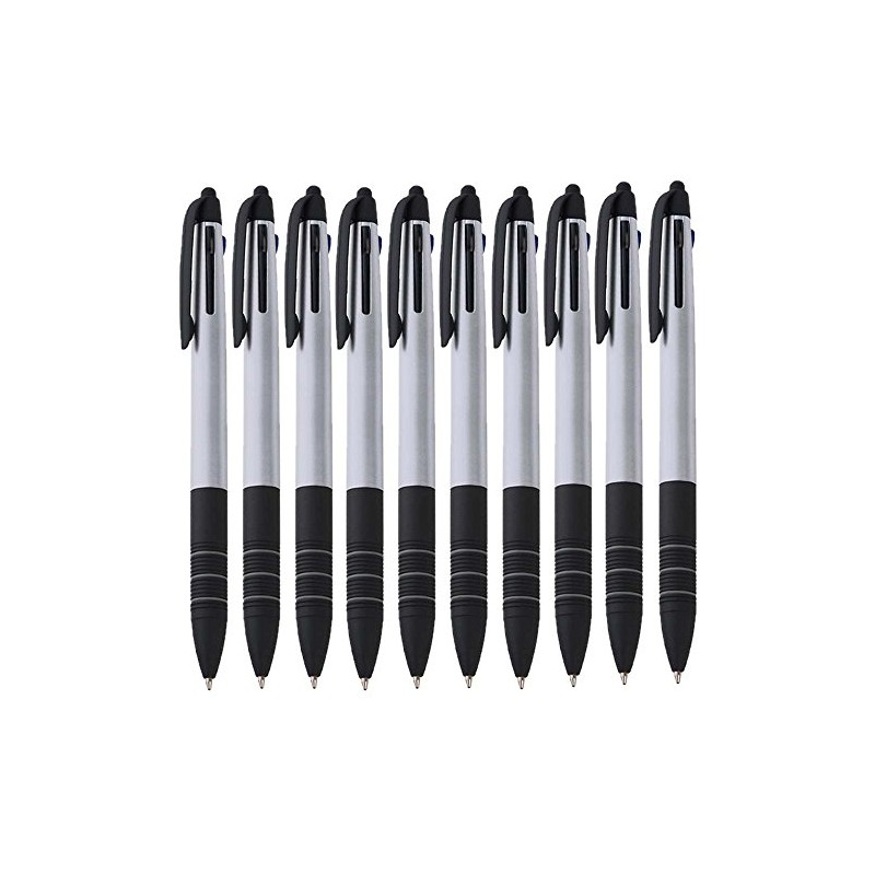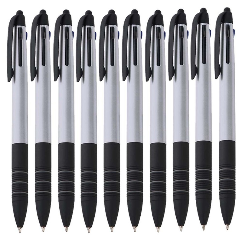 notrash2003® Set of 10 Triple Ballpoint Pens Three Colours Blue Red and Black and Touch Pen 4-in-1 Writing Instrument (Silver)