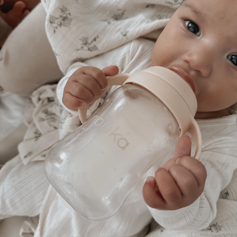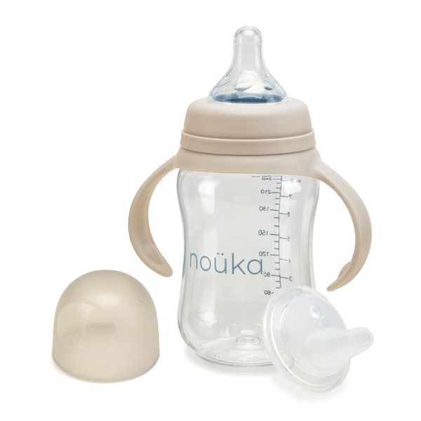 noüka Transitional Baby Bottle/Sippy Cup | Non Spill | Easy Grip Double Handles | Dishwasher Friendly | Sand | Size 8 Oz
