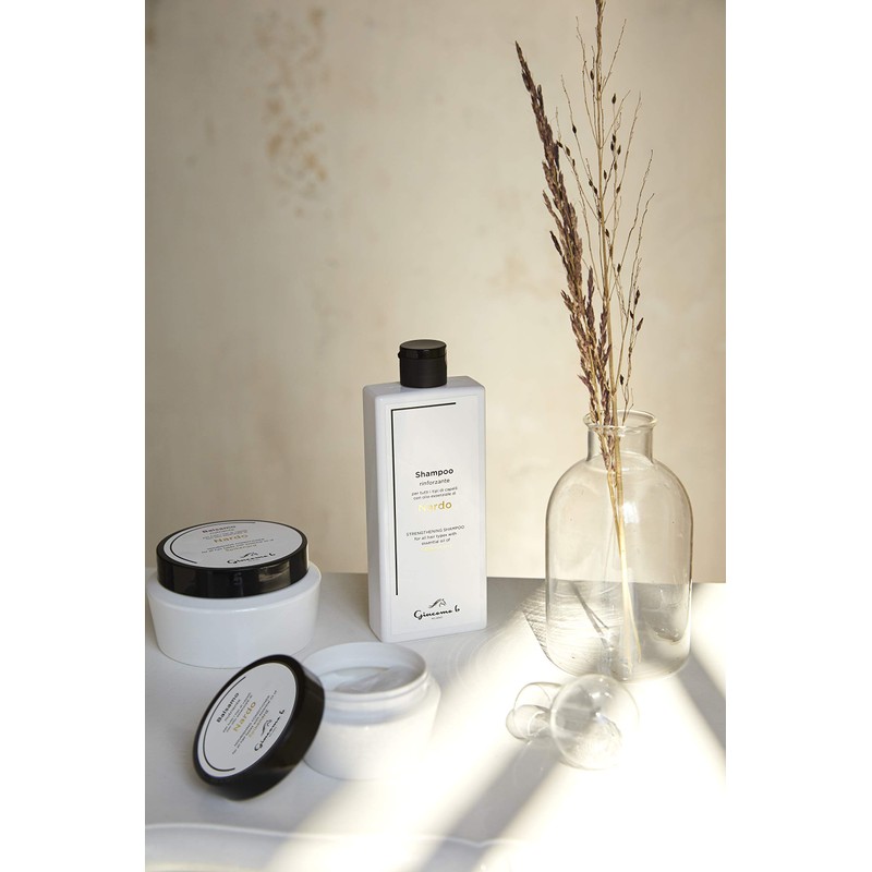 Made with Nardo essential oil, enriched with organic olive oil, vitamin A, E, D and unsaturated fatty acids, nourishes, moisturises and strengthens hair, making it shinier and stronger. Adds softness, volume and luminosity to all hair types.