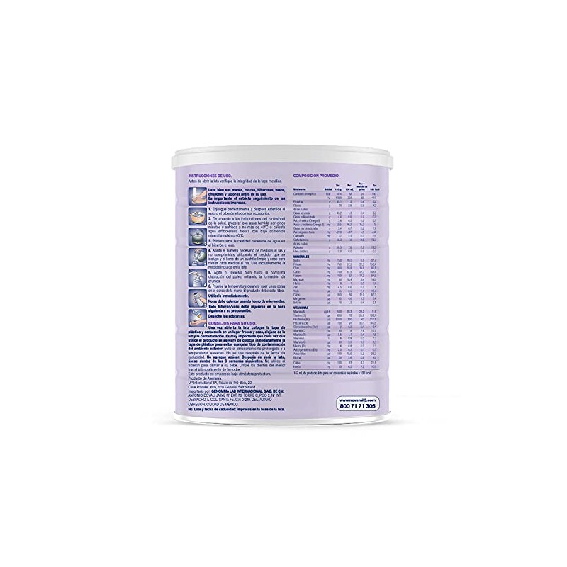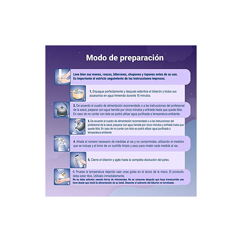 - [ PREPARACIÓN ] 1. Enjuague adecuadamente los utensilios y esterilice los recipientes y accesorios. 2. Preparar con agua hervida por 5 minutos y enfriarla hasta que quede tibia; en caso de no contar con esta se podrá utilizar agua purificada a temperatura ambiente. 3. Primero sirva la cantidad necesaria de agua en el envase. 4. Añada el número necesario de medidas al ras. 5. Cierre el recipiente y agite hasta la completa disolución del polvo. 6. Pruebe la temperatura dejando caer unas gotas en el dorso de la mano. El producto debe estar tibio. Utilícelo inmediatamente.