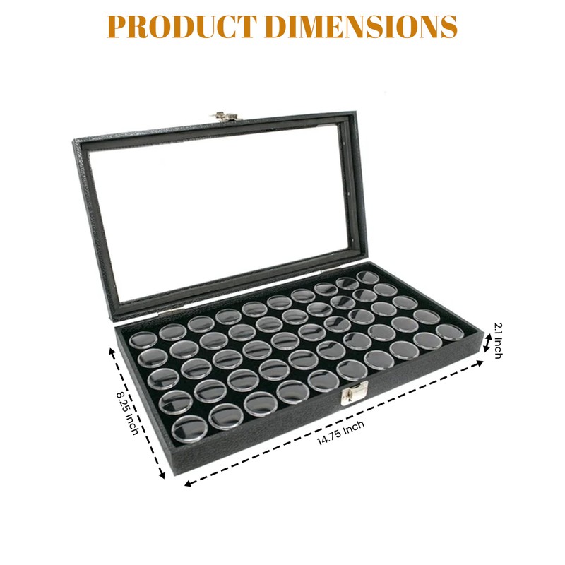 Novel Box Large Jewelry Display Case 14.75x8.25x2.1 + Small Size 50 Gems Jars | Glass Jewelry Box with Lid & Black Tray Foam Liner | Rock Storage Box with Metal Clasp | Display Box for Collectibles