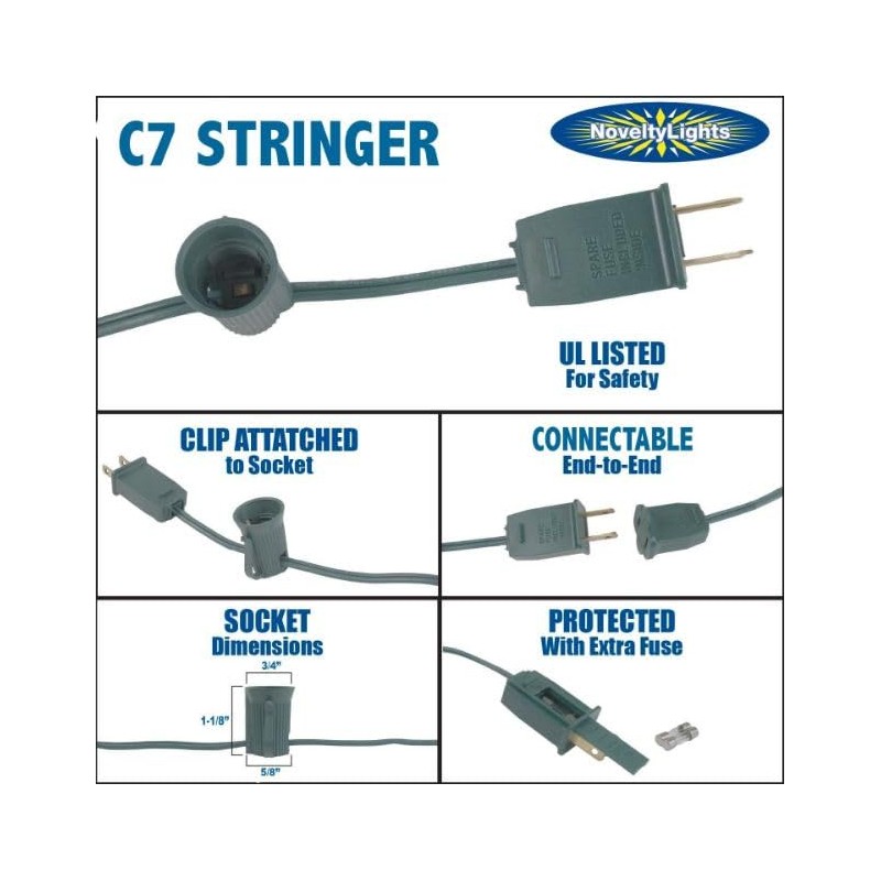 - PREMIUM PACKAGE: Each string features 50 sockets and has a 5 amp fused male plug for indoor and outdoor use. This C7/E12 base stringer uses our incandescent and LED C7, G30, and G40 bulbs, which are sold separately.
