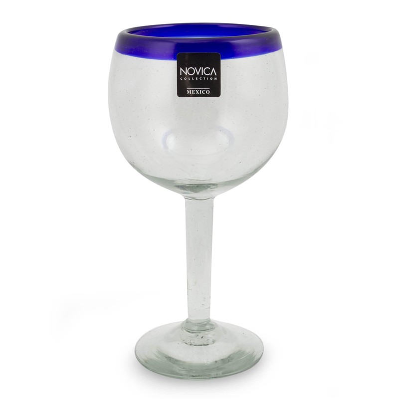 NOVICA 162788"Sapphire Globe Blown Wine Glass, Set of 4, 7.5" H x 3.5"