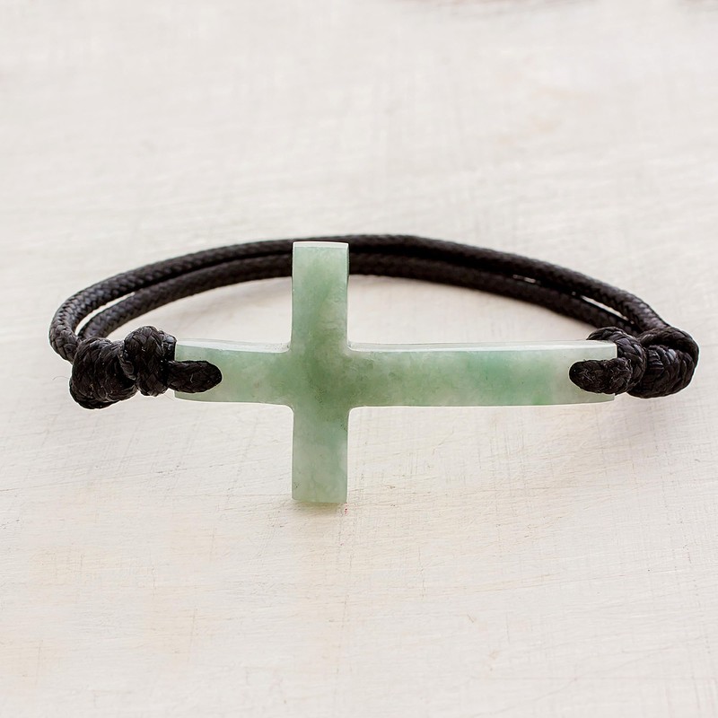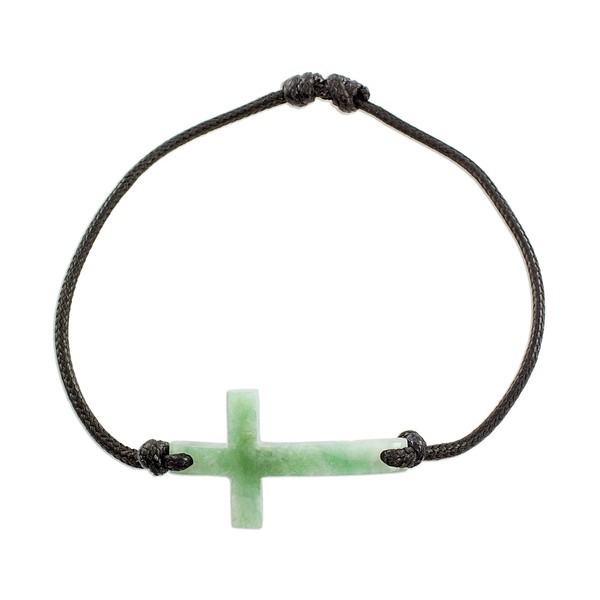 About this item: Guatemalan duo Ruben and Gilda Perez express their Christian faith, designing this evocative bracelet. Circling the wrist with adjustable cotton cord, the bracelet is centered by a cross-shaped pendant that is carved of apple green Mayan jade.