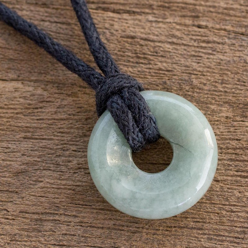 About this item: A circle of apple green jade centers a length of cotton cord, resulting in this Pendant necklace with a loving touch by Guatemalan duo Ruben and Gilda Perez. They work together to create new and innovative designs, giving the cord an adjustable length to fit the wearer with ease.
