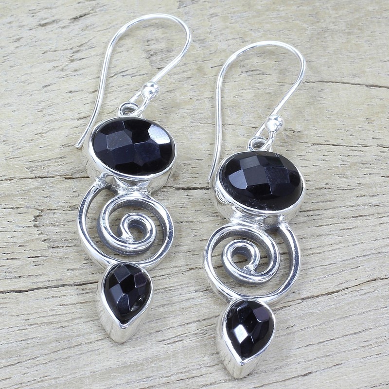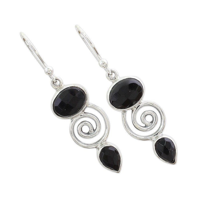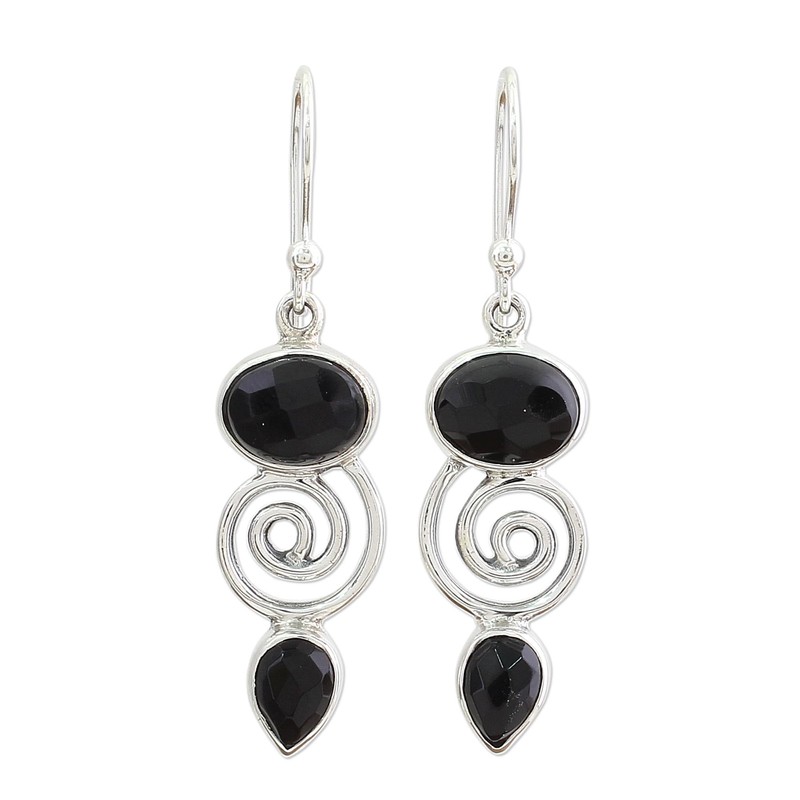 About this item: Darkly mysterious and elegant, faceted onyx invites you on a romantic journey that ends with an onyx tear. The road takes the scenic route in the form of a silver spiral. From Neeru Goel in India, these delightful sterling silver women's earrings are crafted by hand to feature 8 gemstone carats.