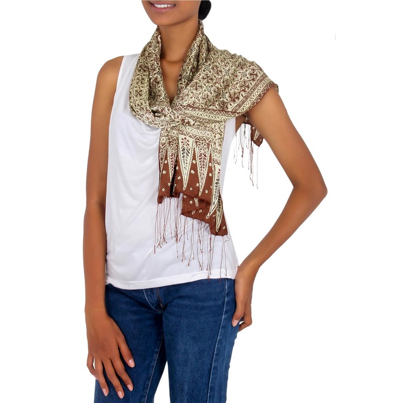 About this item: Jasmine buds amid leaves promise blossoms, beautifully depicted in Java's parang kembang motif. By Yuni Kristina, this elegant scarf is crafted of shimmering silk. She hand-stamps the brown patterns on the ivory textile and adds red and black designs in batik.