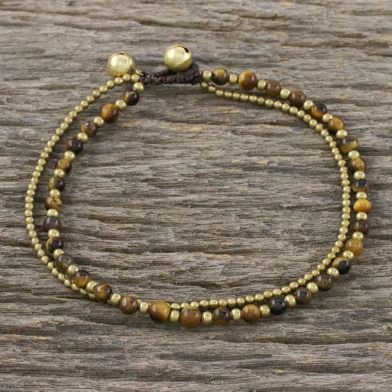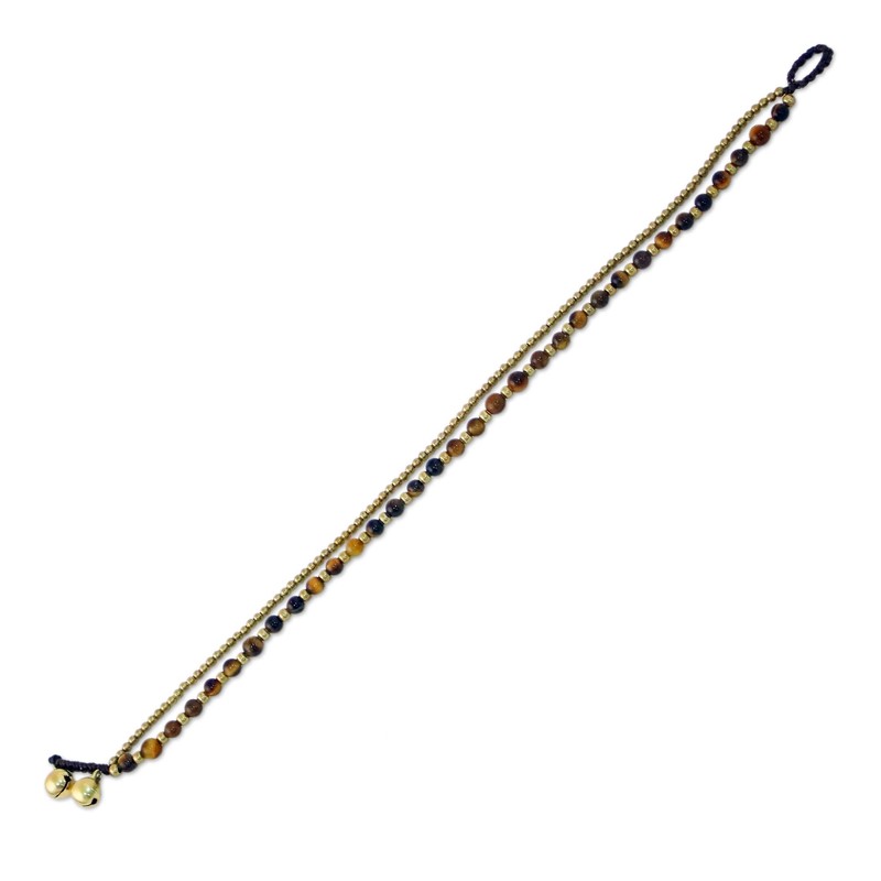 About this item: Thai artisan Tiraphan Hasub carefully chooses stones of tiger's eye, beading the length of this anklet. The beads are alternated with petite brass beads, accompanied by a beaded strand of brass. The fashionable anklet is completed with two ringing brass bell buttons, giving it an adjustable length.