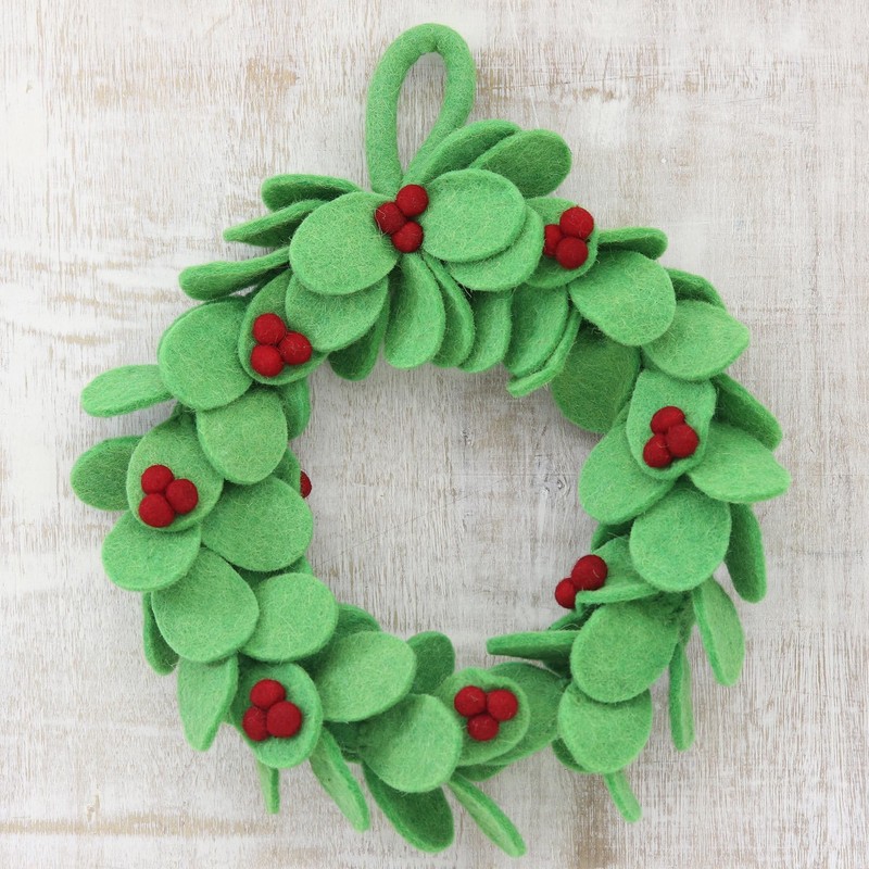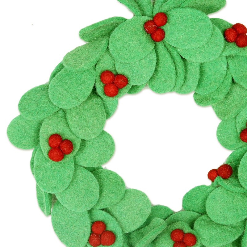 About this item: Accompanied by brilliant red berries, vivid green leaves form this handmade wreath from India. Rajesh Gehlot designs and crafts the holiday wreath from pure wool felt, adding a loop at the top of the wreath for easy display.Hand-crafted item -- color, size and/or motif may vary slightly