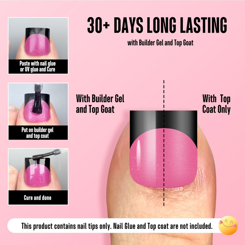 - SUITABLE FOR VARIOUS TOE NAIL BED SHAPES: The slightly longer design of the nail tips makes them suitable for individuals with slightly long, medium (square-shaped), or short nail beds. If you find the tips too long, you can file them down to your desired length. For even longer nail tips, check out our other products, such as the Long Square or Extra Long toe nail tips.