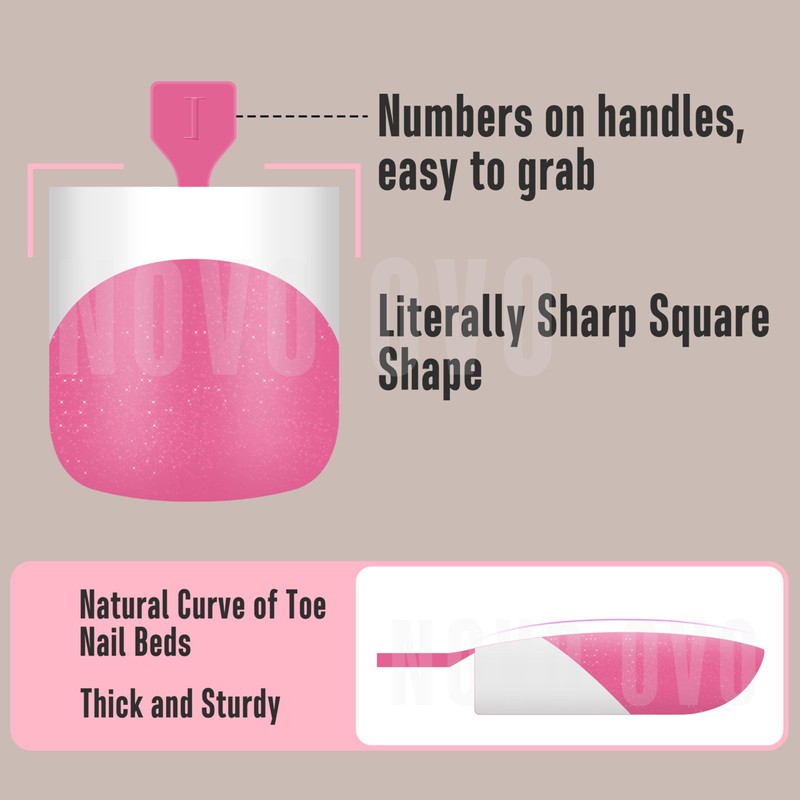 - GET THE PERFECT FRENCH TIP PEDICURE WITH JUST A FEW SIMPLE STEPS! NOVO OVO pre-designed nails are here to make your pedicure easier! We've already applied a tip primer and base coat on the soft gel nail tips. Simply stick them on your nails with UV gel or glue, then add a layer of builder gel and top coat. In just 15 minutes, you'll have stunning French tips on your toenails!