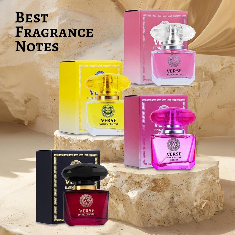 - 4-Piece Perfume Set: NovoGlow’s 4-Piece Fragrance Set comes complete with 4 high-quality fragrances boasting premium accords– Verse Golden Crystal, Verse Dark Crystal, Verse Pink Crystal Intense and Verse Pink Crystal – each one housed in a 30 ml bottle.