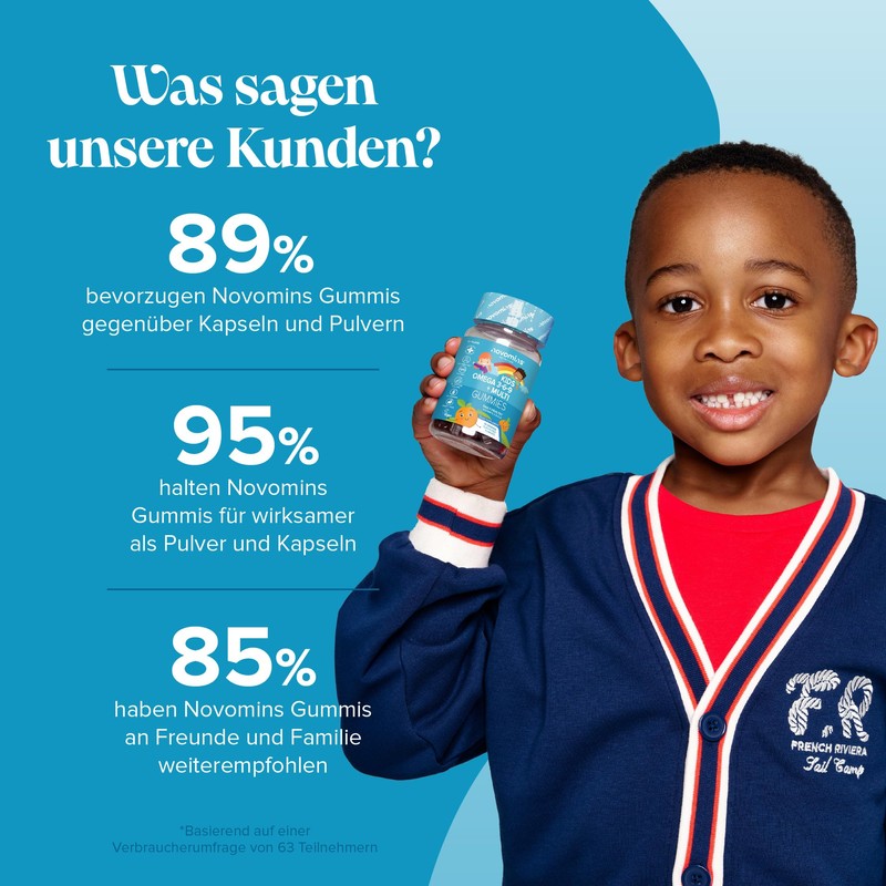 - WARUM NOVOMINS KINDER OMEGA 3 6 9 GUMMIBÄRCHEN: Novomins ist stolz darauf, Ihnen Nahrungsergänzungsmittel von höchster Qualität anzubieten, die sicher sind und aus ethischen Quellen stammen. Unsere Omega-3-Gummis für Kinder werden unter den strengsten Herstellungsstandards (GMP) mit den reinsten Qualitätszutaten hergestellt, die aus ethischen Quellen stammen und leicht verdaulich sind.