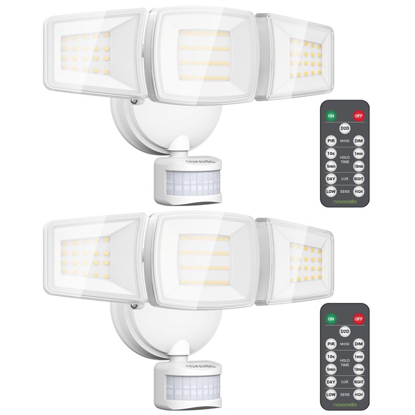 NOVOSTELLA Security Lights Motion Sensor Outdoor, 2Pack LED Flood Lights with Remote, Dusk to Dawn 45W 5000lm 5000K, 3 Heads Wired Wall Adjustable Floodlights, IP65 Waterproof for Garage Yard House