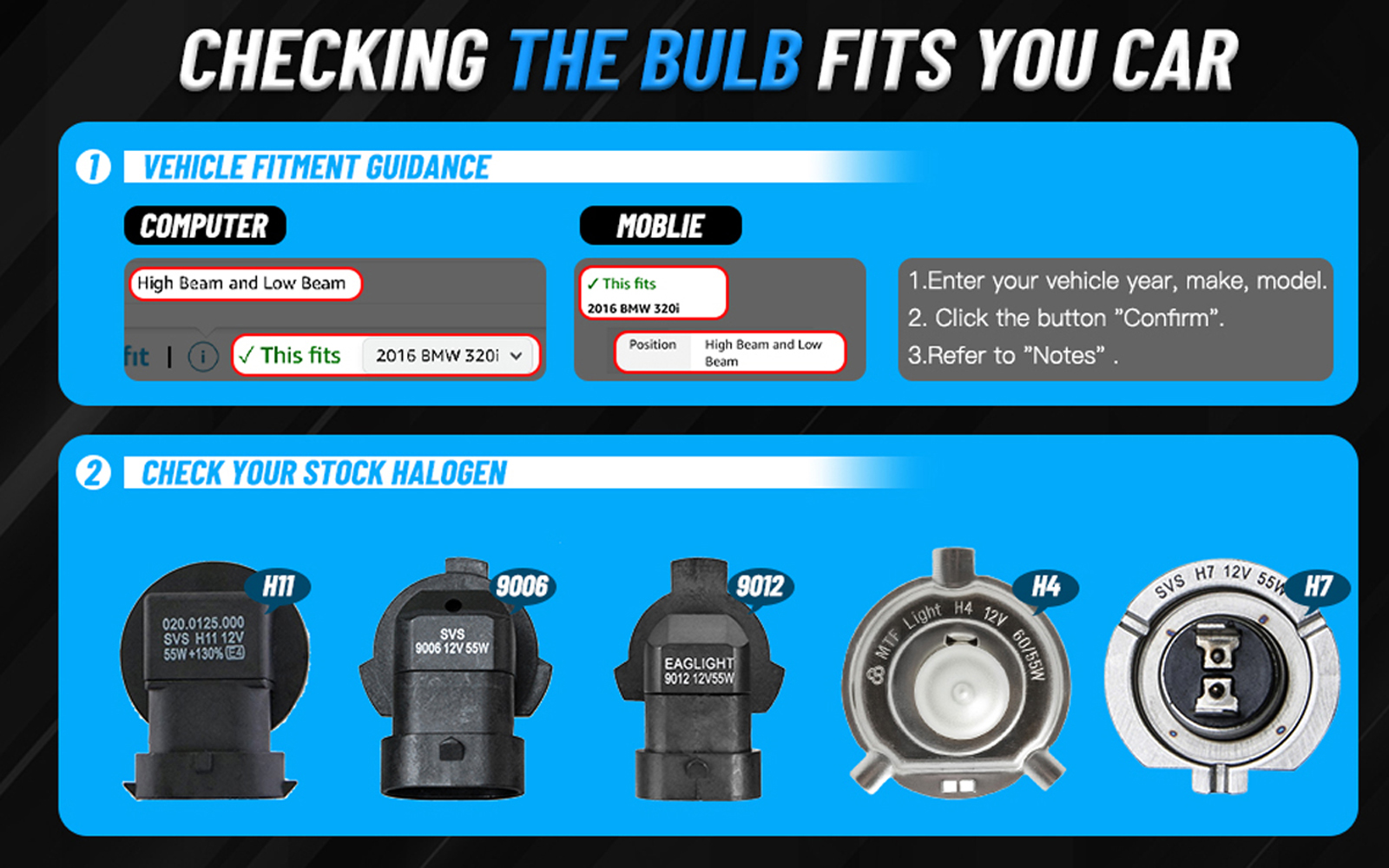 3. If you are unsure your bulb type, please do remember send message to tell us your car make, model, year and other information which is helpful to check bulb type. for example: