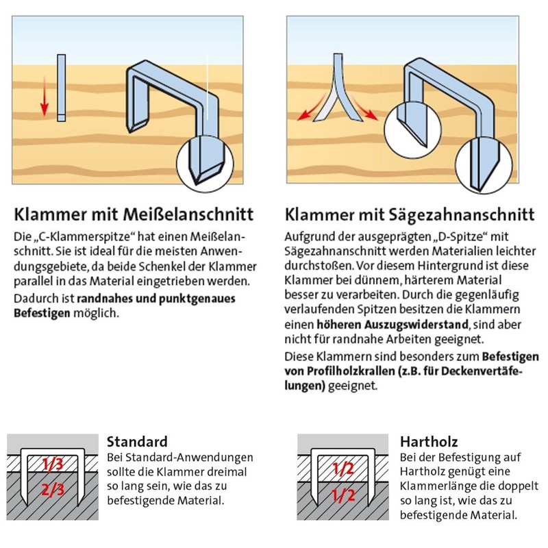 • Optimale Klammerlänge Für das Heftmaterial sollten Sie etwa 1/3 der Klammerlänge verwenden. Für das Verankerungsmaterial empfehlen wir etwa 2/3 der Klammerlänge