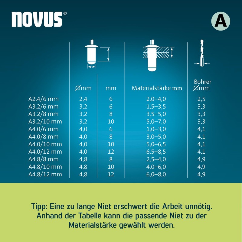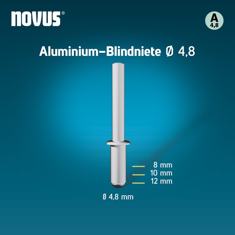 Novus Tools Aluminium Blind Rivets Diameter 4.8 mm, 8 mm Length, 30 Rivets, 2.5-4.0 mm Clamping Length, Ideal for Fixing Non-ferrous Metal, Plastic, Leather and Fabrics