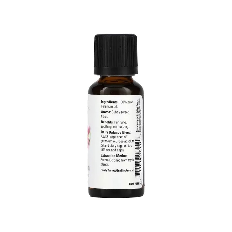 El aceite esencial de geranio de Now Foods, 100 % puro y natural, se extrae de las hojas y flores del Pelargonium graveolens, y es conocido por su exquisito aroma floral y sus propiedades revitalizantes. Su fragancia dulce, suave y equilibrante ayuda a armonizar las emociones, reducir el estrés y elevar el ánimo. En el cuidado personal, es ideal para mejorar el aspecto de la piel, tonificar y promover una apariencia radiante.