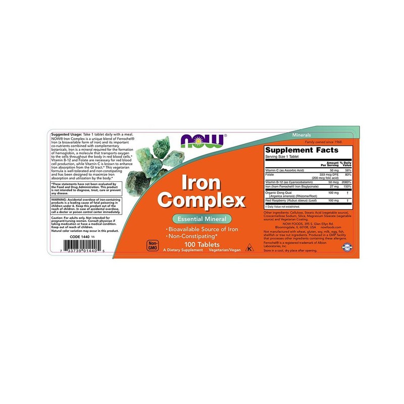 To Iron Complex composition of NOW with advanced formula iron Ferrochel ® is enriched with vitamin C, B-12, folic acid, herb extract dong quai and red raspberry, which help builders in the absorption of minerals, creating erythrocytes and biochemical processes responsible for energy production.