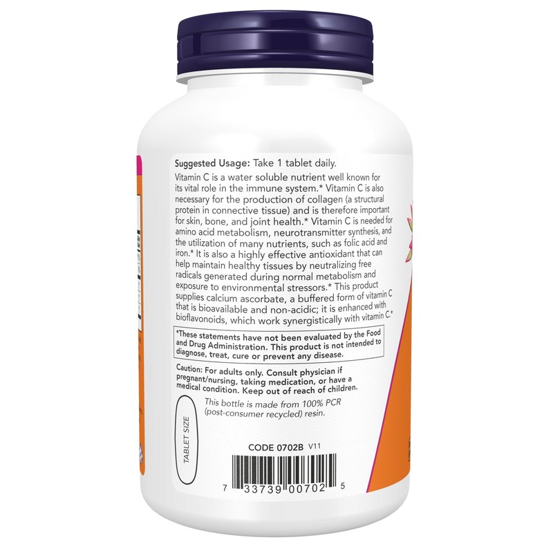 Vitamin C is a water soluble nutrient well known for its vital role in the immune system.* Vitamin C is also necessary for the production of collagen (a structural protein in connective tissue) and is therefore important for skin, bone, and joint health.* Vitamin C is needed for amino acid metabolism, neurotransmitter synthesis, and the utilization of many nutrients, such as folic acid and iron.* It is also a highly effective antioxidant that can help maintain healthy tissues by neutralizing free radicals generated during normal metabolism and exposure to environmental stressors.* This product supplies calcium ascorbate, a buffered form of vitamin C that is bioavailable and non- acidic; it is enhanced with bioflavonoids, which work synergistically with vitamin C.* Natural color variation may occur in this product.