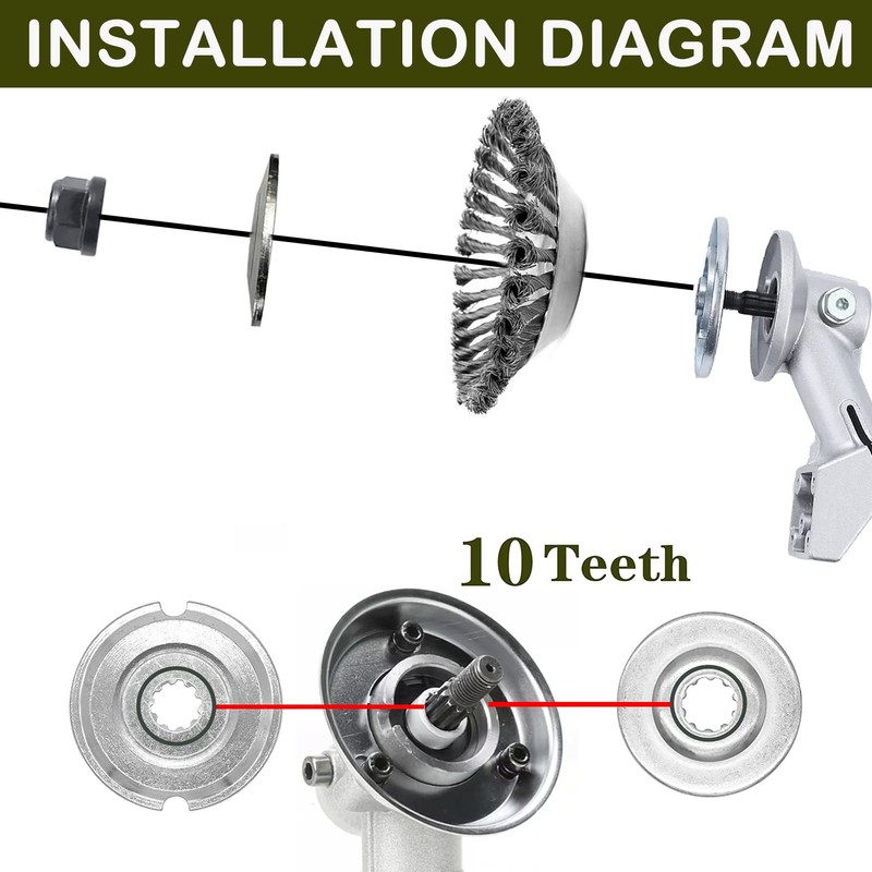 【Two Packs Different Adapter Kits】Our weed eater head is equipped with two sets of adapter kits. The first kit - 1 x Thrust plate guard washer (10 teeth)/ 1 x Thrust washer (10 teeth)/ 1 x Collar nut/ 1 x Allen Wrench; The second kit - 1 x Thrust plate guard washer (6 teeth)/ 1 x Thrust washer/ 1 x Rider plate/ 1 x Collar nut/ 1 x Allen Wrench