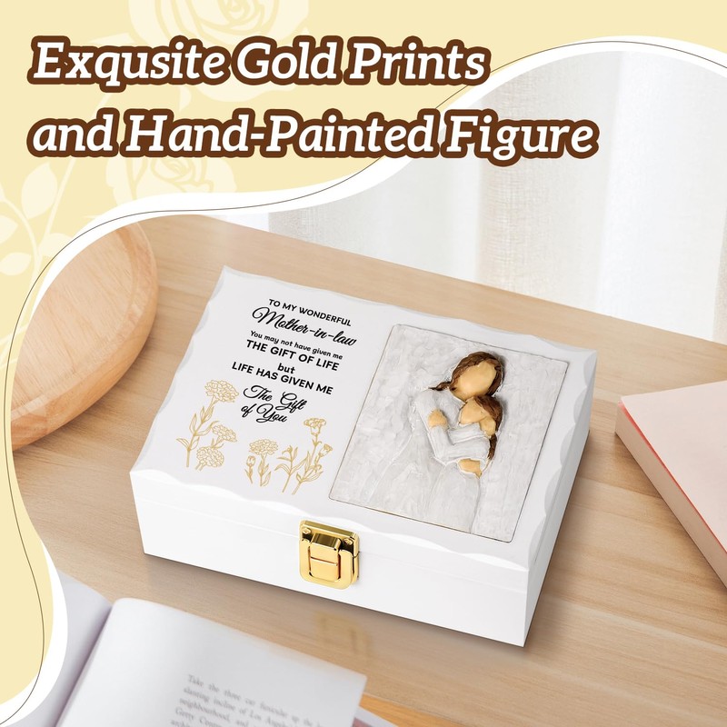 Function: Celebrate the special bond with your mother‑in‑law with this beautifully designed box. The heartfelt inscription reads: ""To my wonderful mother in law you may not have given me the gift of life but life has given me the gift of you."" A lovingly crafted figurine and ample storage make this a perfect gift for any occasion.