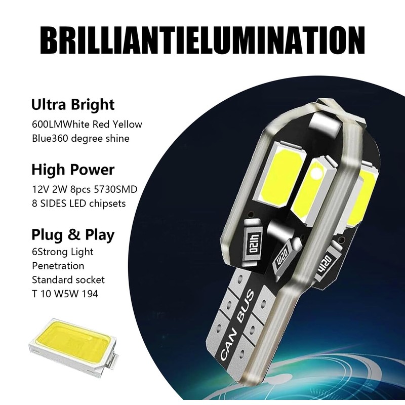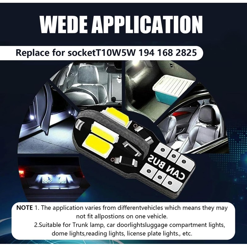 - Product List: You will receive 10 pieces car led bulbs, model number T10-5630-8SMD, size 11mm x 25mm x 9mm/0.43" x 0.98" x 0.35". Please check the bulb model your car needs before buying, to avoid mismatch between the two.