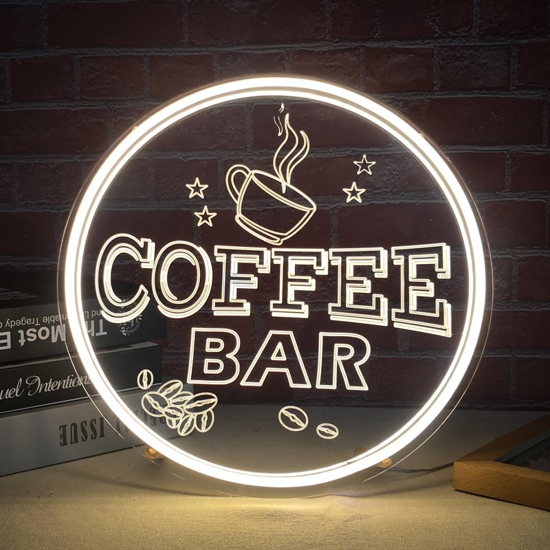This 12” round coffee neon light sign uses silicone LED neon strip with 3D engraving technology. The 3D carving letters are lighted up by the surrounding neon lights.