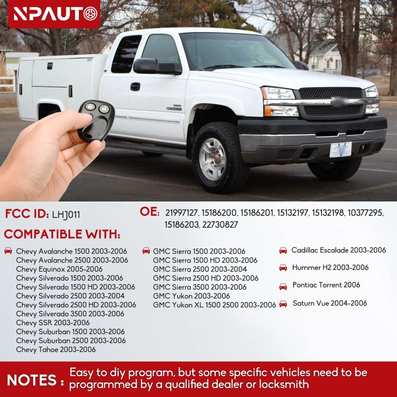 [Compatibility]: keyless fobs with ignition key replacement for Chevy Silverado 1500 2500 3500 HD 2003 2004 2005 2006 | Avalanche 03-06 | Equinox 05-06 | Suburban Chevy SSR Tahoe 03-06 | GMC Sierra Yukon XL 03-06 | Cadillac Escalade 03-06 | Hummer H2 03-06 | Saturn Vue 04-06 | Pontiac Torrent 2006【NOTE】Before purchasing this order, please check the description or use the year/make/model drop down bar to confirm the compatibility