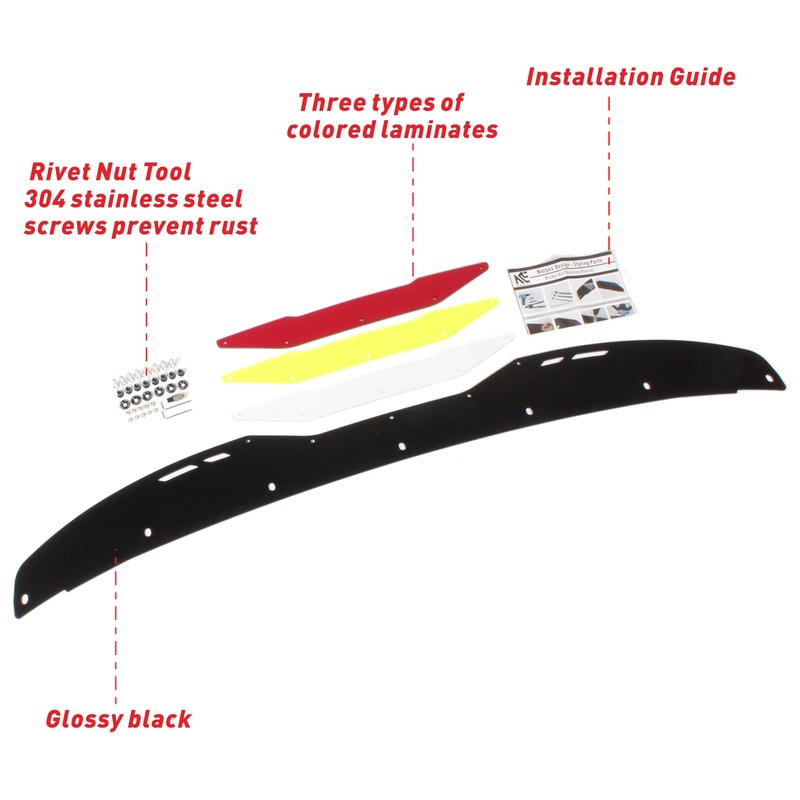 - Material and Finish: PMMA, main plate gloss black, central plates with transparent, green and red, all wickerbill has protective film on both sides, please tear it off after installation