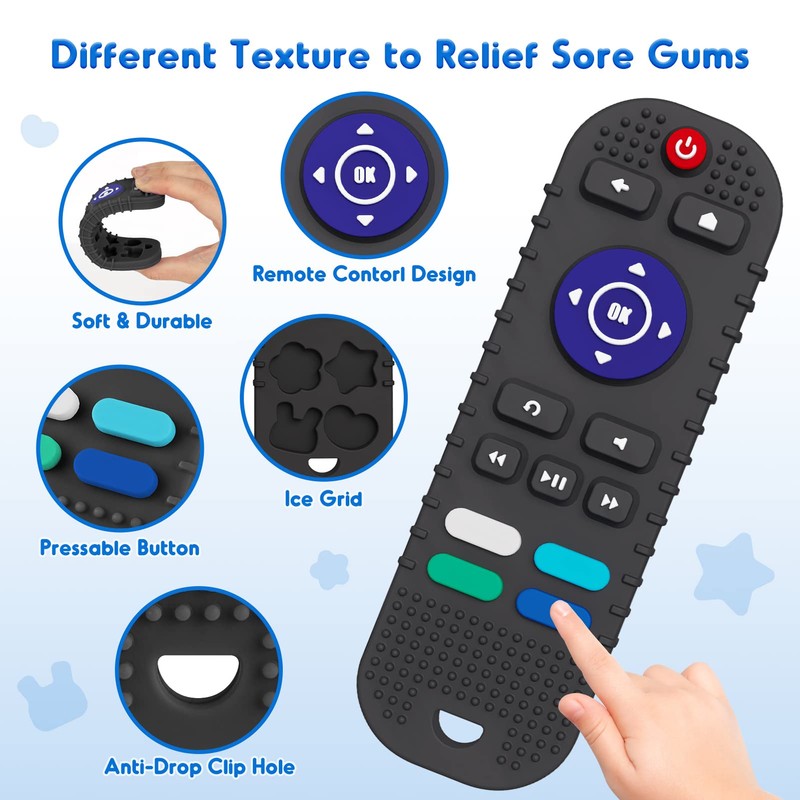 - đăRemote Teether for BabyăChildren like to bite the remote control, so we designed a safer and easier to clean remote control shape teether, your baby's exclusive remote control. Remote control teether is not only safer but also easier to clean. Teether toy comes in a suitable size that makes it easy for babies to grip and exercise their hand grip ability. Made from 100% silicone, non-toxic and free from PBA, ensuring that your baby can bite without any worries.