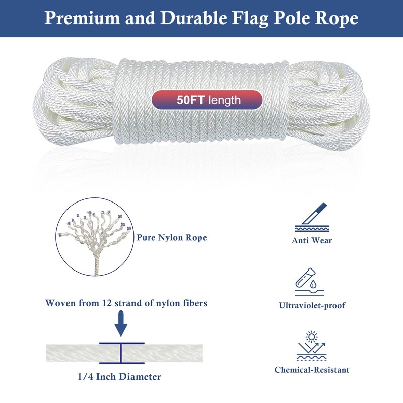 - Flagpole Halyard Rope▶NQ flag pole rope is woven from 12 strands of pure nylon rope and can be used for a long time in various outdoor environments. 1/4 inch diameter rope can easily pass through the pulley,50FT long compatible with flagpoles up to 25FT. It can also be used as a clothesline, hammock rope, suitable for camping, gardens, and other outdoor scenarios.