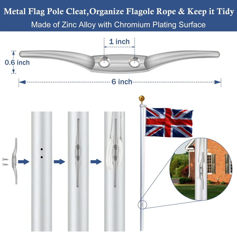 - Flag Pole Cleat▶Made of Zinc Alloy with unique bright silver finish decor,durable and long lasting use for fastening rope to flagpole.2pcs stainless steel mounting screws can fix the cleat on flagpole more easy