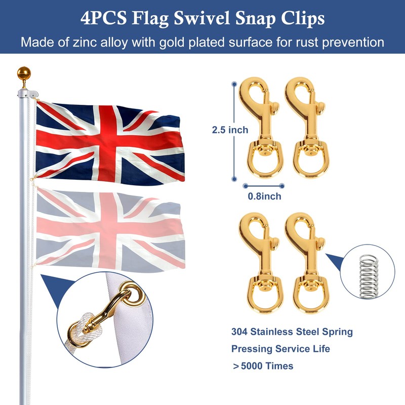 - Flag Swivel Hooks▶Made of Zinc Alloy with unique bright gold finish decor,.0.4’’ opening size is suitable for most standard grommet flags,0.5’’ eye diameter is perfect fit NQ 1/4’’ diameter flagpole rope.360 degree rotating design can prevent the flag from tangling,comes with 4pcs can fly TWO flags.
