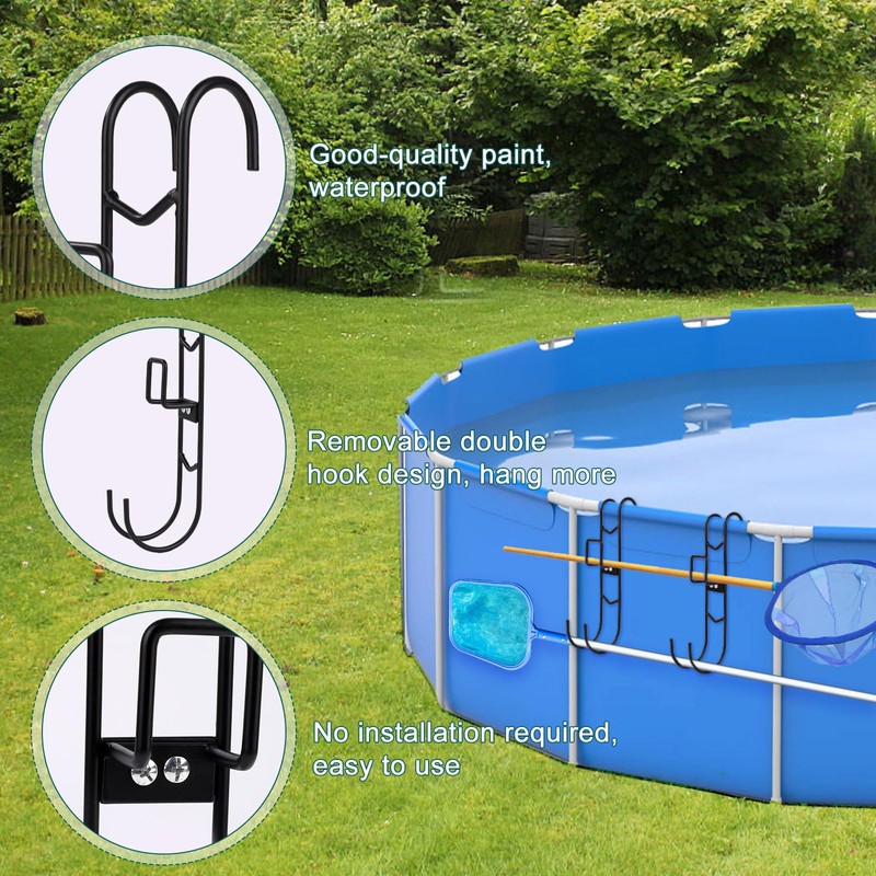 - Wide Application: Our poolside hooks have a wide range of application. You can hang it on the edge of a poolside pool to store pool skimmers, pool cleaning poles, telescopic poles, water pipes, leaf rakes, skimming nets, brushes, etc. They are very practical.