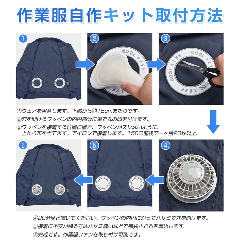 • DIY Kit for Work Clothes: This work clothes can be reinforce the part where you attach the fan for your work wear with your own patch. Create the perfect size for fans and make work clothes yourself