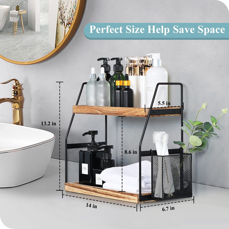 - MULTIPURPOSE: The bathroom counter organizer is also suitable for kitchen, bedroom, and vanity. It can be as a cosmetic organizer, spice organizer, coffee organizer, etc. The wooden elements of the bathroom organizer can also decorate your counters and are a great addition to your home.