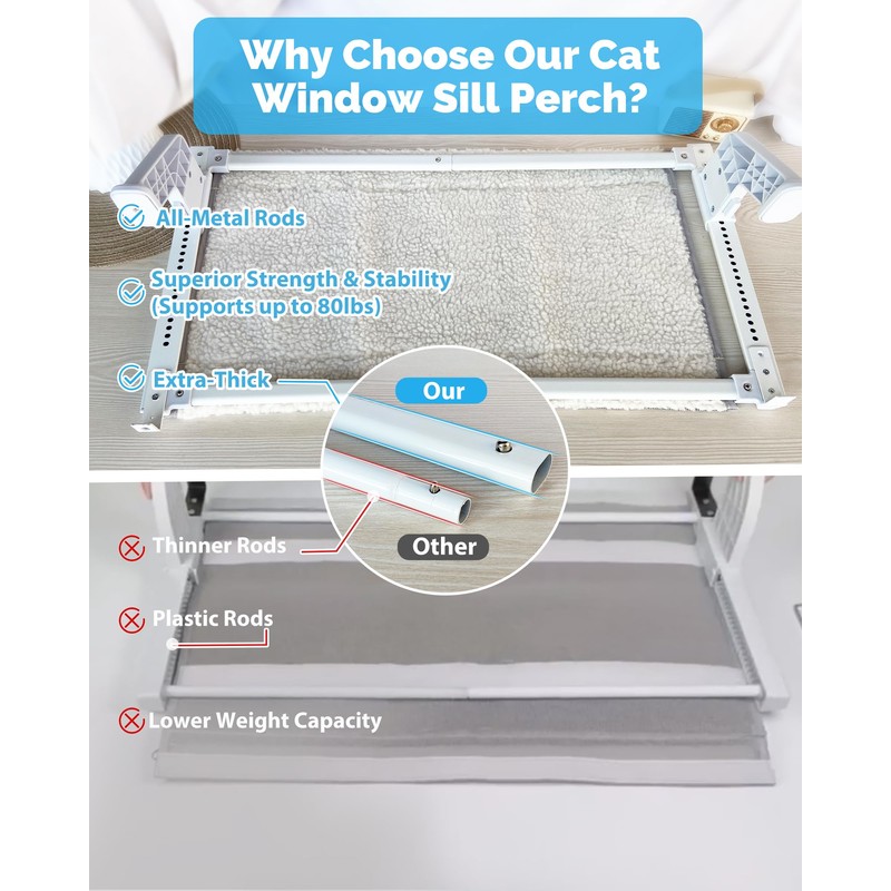 - Ultimate Strength & Durability: Engineered with extra-thick, all-metal rods, our cat window perch supports up to 100 lbs, making it perfect for large cats or multi-cat households. This cat window hammock is built to withstand everyday use, offering a stable and secure resting place for your feline to enjoy the view from the cat window shelf.