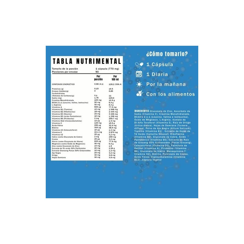 MULTIVITAMÍNICO Con una sinergia inteligente con 26 vitaminas, minerales, extractos herbales, ginseng, vitamina K2, creatina, ortiga, damiana, y extracto de té verde. Con cápsulas que aportan 776 mg (hasta 25% más contenido).