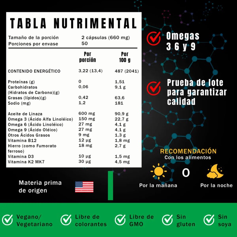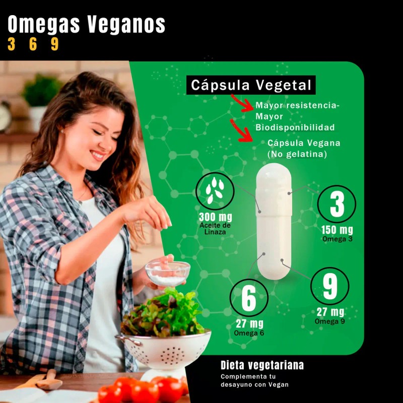 - Omega 3, 6 y 9 (El Trío Dinámico Plant-Based): ¡Olvídate del pescado! Aquí tienes la armonía perfecta de ácidos grasos esenciales directamente de fuentes vegetales. Son los directores de orquesta que mantienen tu corazón latiendo fuerte, tu cerebro a toda máquina con ideas geniales y tu piel brillando como un amanecer vegano.