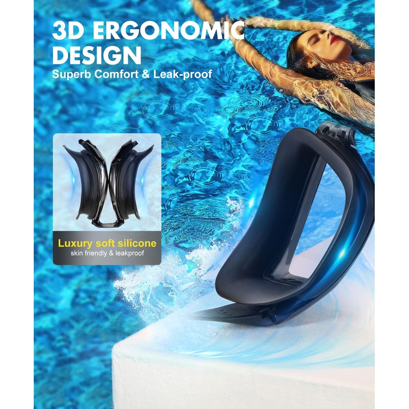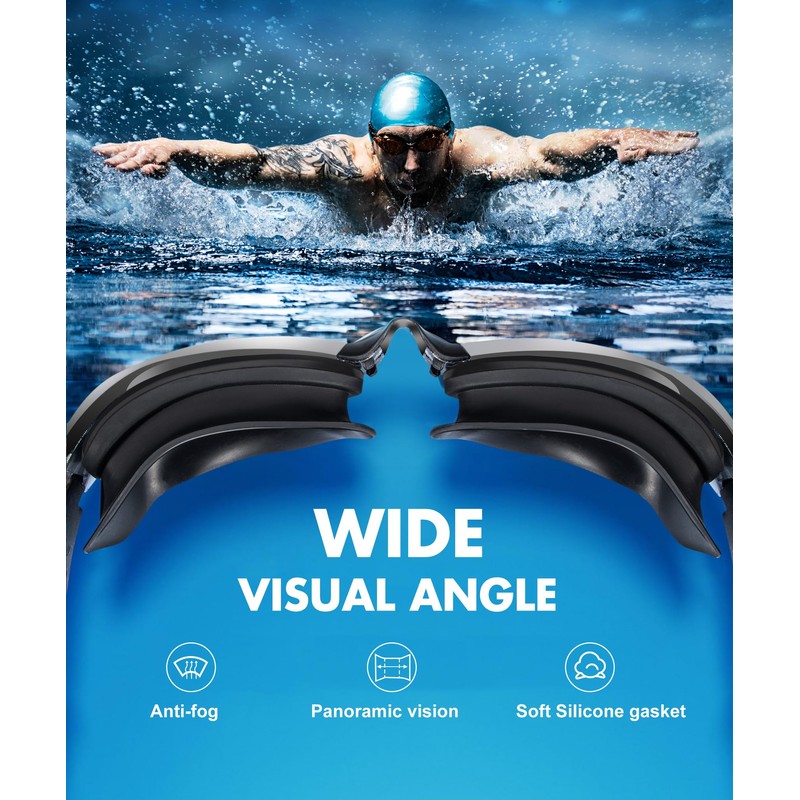 - [ANTI-FOG & UV400 PROTECTION] The inner lenses of the swimming goggles feature the latest anti-fog treatment, allowing you to see underwater without blurring or distortion. The outer surface coating of the lens has UVA/UVB protection, which filters out irregular light and avoids glare, better protects your eyes from sunlight and harmful glare, and restores true colours. Ideal for outdoor swimming, pool swimming, surfing and other open water related