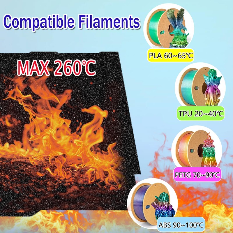 - For good adhesion: please clean the surface of the spring steel plate regularly with water and alcohol or IPA before using our plate. Recommended filaments and temperatures: PLA: 60-65°C; TPU: 20-40°C; ABS: 90-100°C; PETG: 70-90°C.
