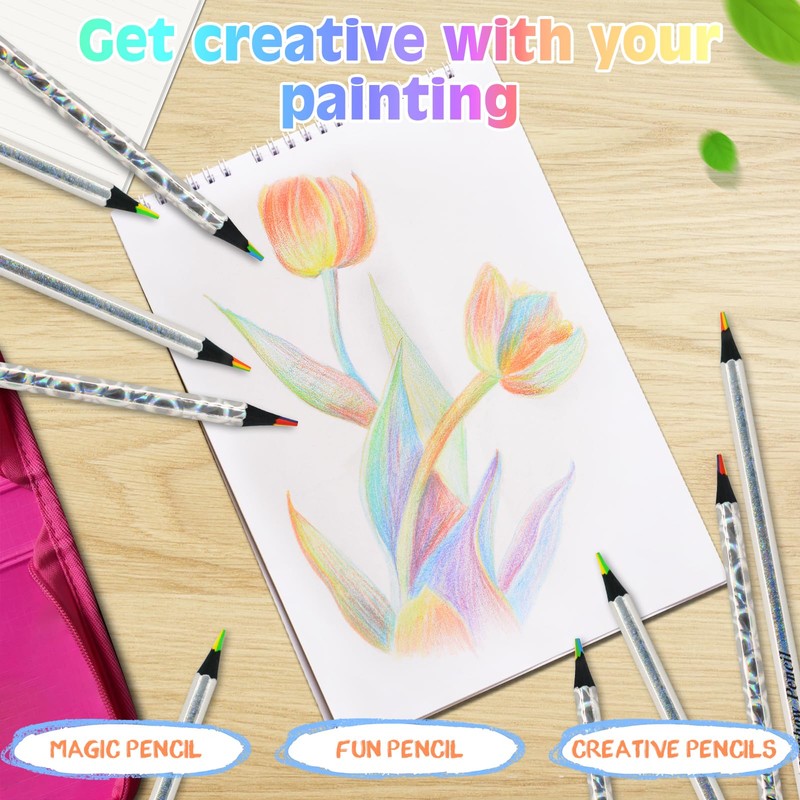 - Holographic designs rainbow pencils: the new 7 colours in 1 rainbow pencils are here, the sparkling and cool appearance brings you a new feeling Kids will love the shiny look of these fashionable, glittery coloured pencils! The set is perfect for giving as a gift and children can share it with each other. Thanks to the compact size of the set, it is easy to take with you, so that children can draw and paint anywhere they are.