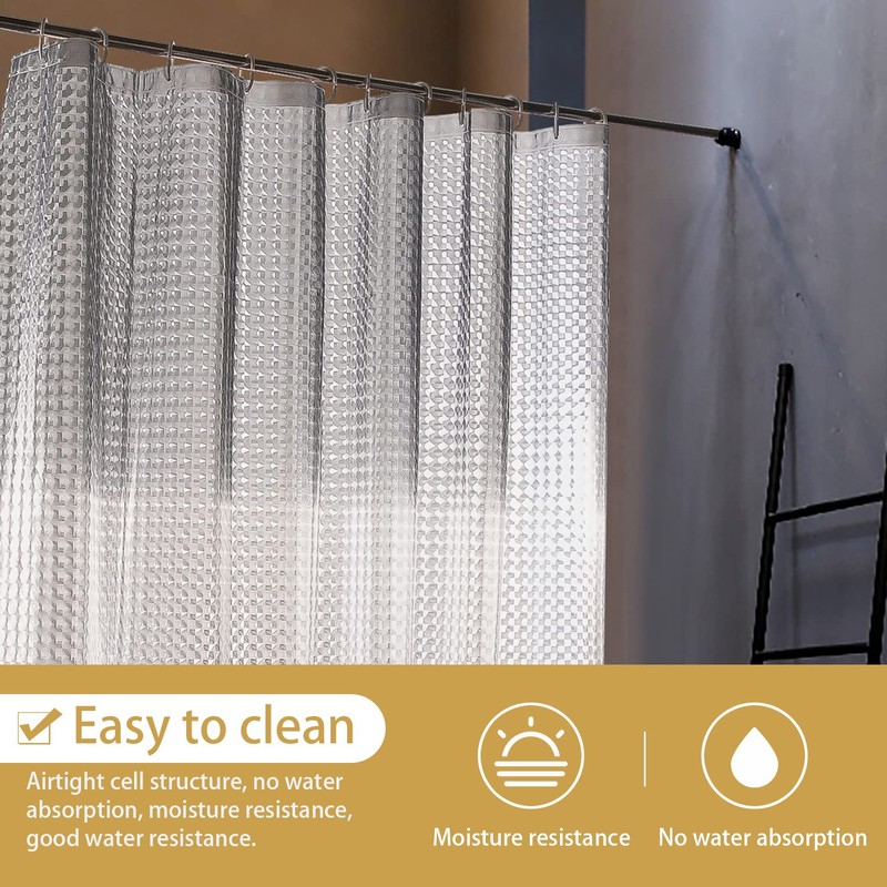- Durable EVA shower curtain: Our shower curtain is made of 6 Gauge EVA, compared with traditional PVC materials, they are healthier. There are 2 heavy duty magnets at the bottom of our shower curtain to keep the liner in place and keep the cold air out. The clear shower curtain provides 6 sturdy rust-resistant metal grommet holes to accommodate the shower curtain hooks, or other decorative hooks.