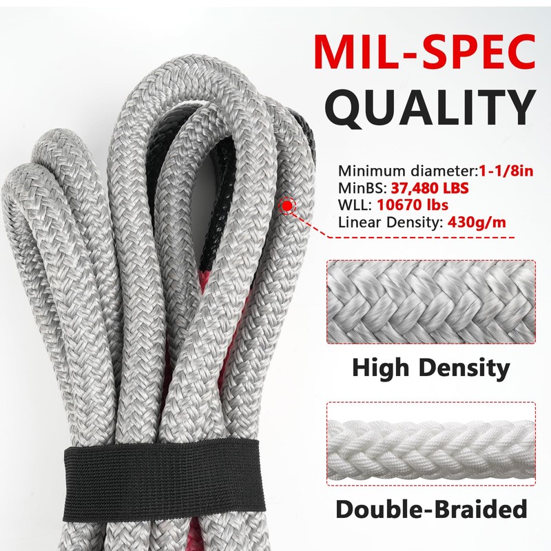 - Double Diamond Braid and Vinyl Polymer Coating: Each fiber of the double diamond braid shell is soaked in a polymer coating. Waterproof and UV resistant, it can withstand extreme temperatures from -40F-215F. Both ends of the offroad power stretch snatch rope are covered with polyurethane, which are more wear-resistant, corrosion-resistant and easy to clean than other cloth protective sleeves.