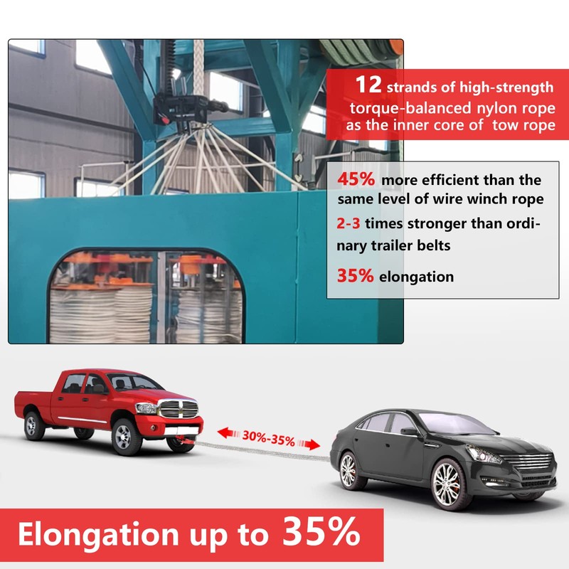 - Elongation up to 35%: Using nylon 66 material with higher strength, better resilience and abrasion resistance, the elongation can reach 30%-35%. Recovery ropes can safely and effectively pull out the vehicle stuck in the mud, sand, snow or high-slope road, without transferring the impact force. Make sure your vehicle is not damaged in any way.